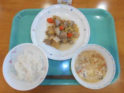 麦ごはん 牛乳 豚肉と大根のうま煮 かみなり汁