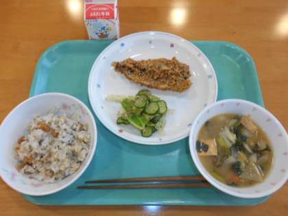 豆ごはん 牛乳 魚のごま揚げ 野菜のゆかりかけ