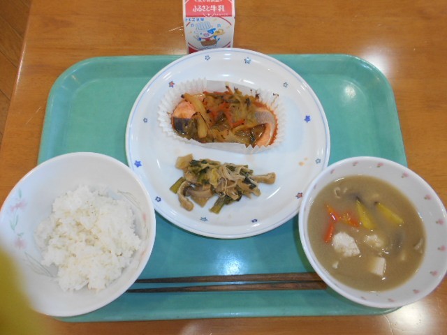 ごはん  牛乳 鮭のチャンチャン焼き きのこ入り煮びたし さつま汁
