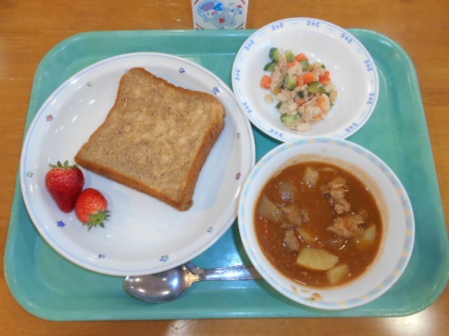チョコフレンチトースト 牛乳 トマトシチュー ビーンズサラダ くだもの