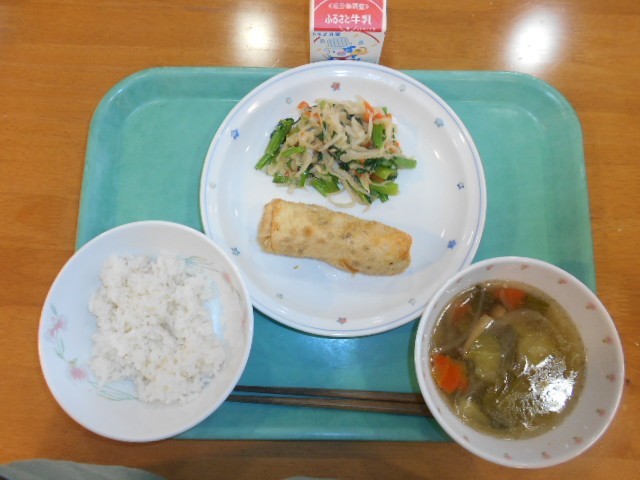 麦ごはん 牛乳 小松菜と豚キムチの春巻き 切り干し大根の塩ナムル きのこと青菜のスープ