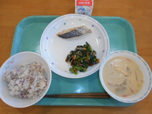 ゆかりとじゃこのごはん 牛乳 魚の照り焼き 青菜ののりあえ 呉汁