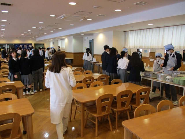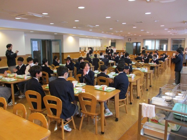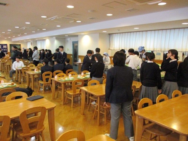 1年生は今週月曜日よりランチルーム給食を実施。2クラス合同で給食を実施です。