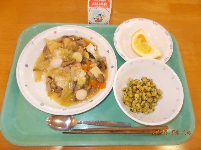 中華丼 牛乳 大豆の磯揚げ くだもの