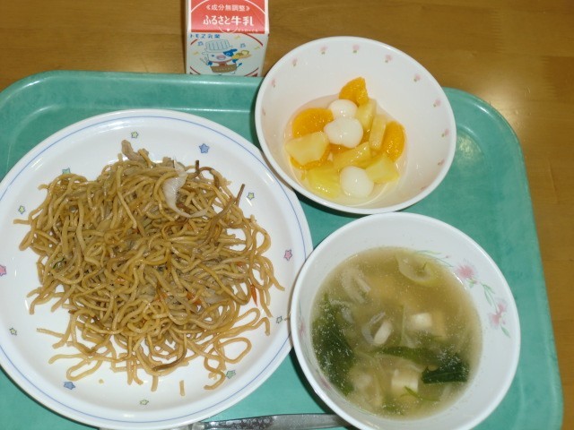 塩焼きそば 牛乳 豆腐とえのきだけのスープ フルーツ白玉
