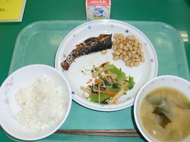麦ごはん 牛乳 鮭の南部焼き カリカリ油揚げと野菜のひたし ぶどう豆 みそ汁