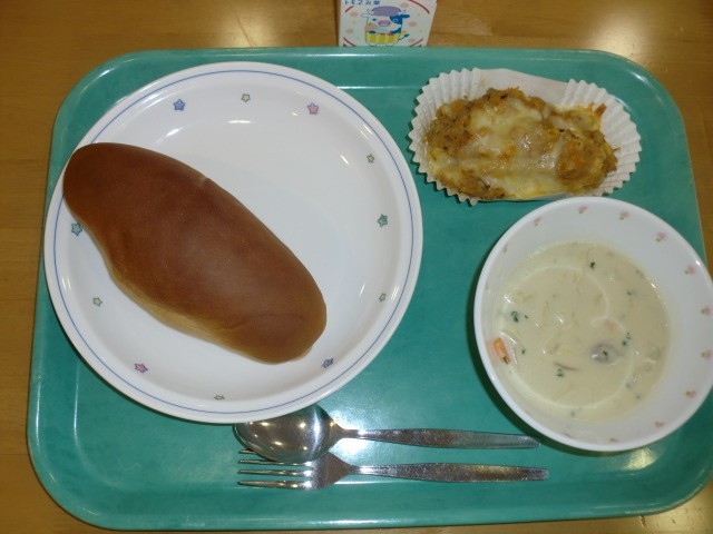 黒砂糖パン 牛乳 ポテトグラタン キャベツのクリームスープ