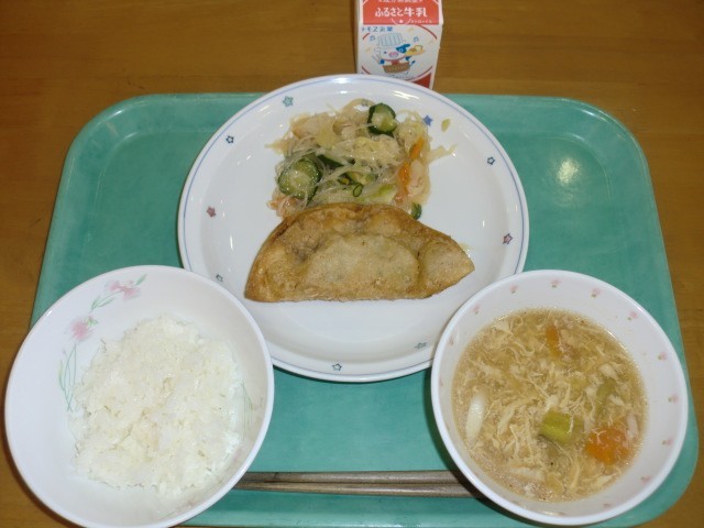 ごはん(有機米) 牛乳 ジャンボぎょうざ 春雨サラダ かみなり汁
