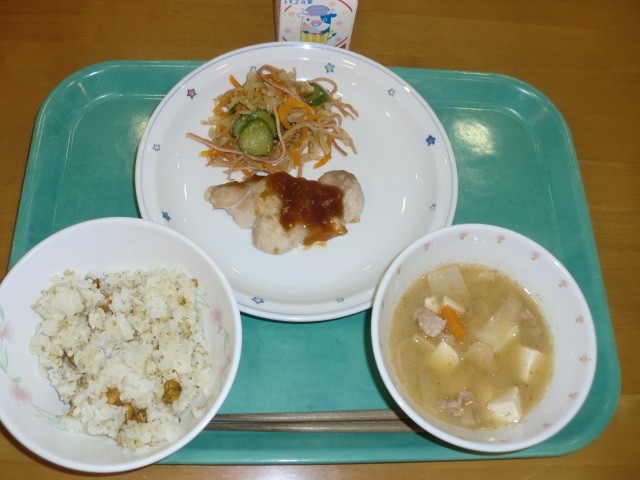 豆ごはん 牛乳 鶏肉の照り焼きソース かみかみサラダ 豚汁