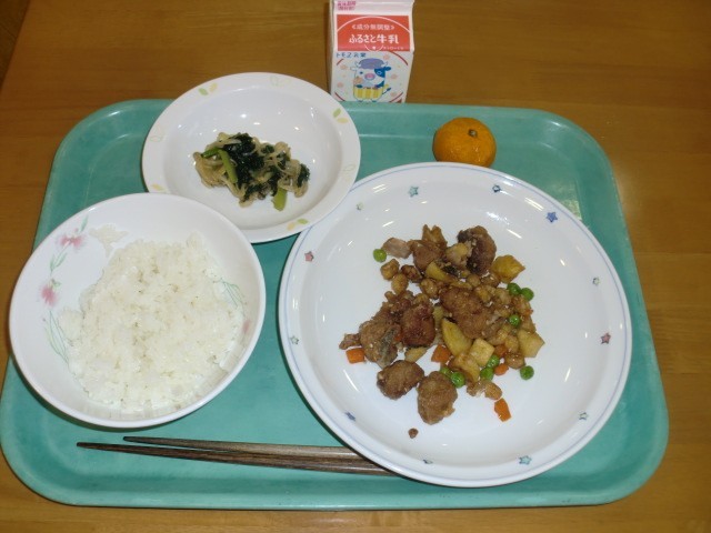 ごはん(有機米) 牛乳 かつおの揚げ煮(有機にんじん入り) 青菜とわかめのレモンじょうゆ くだもの