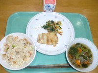●本日の献立●えびチャーハン 牛乳 小松菜とチーズカレー春巻き わかめスープ ぶ...