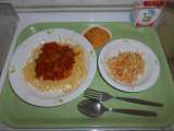 ●本日の献立● スパゲティ地中海ソース 牛乳 パリパリサラダ かぼちゃのケーキ...