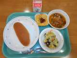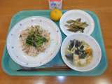 ●本日の献立● スパゲッティ地中海ソース 牛乳 パリパリサラダ かぼちゃのケ...