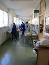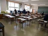 教室の机椅子を廊下に出し、床や壁をきれいにしていきます。