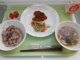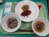 ●本日の献立● 赤飯 セレクト飲み物 チキンカツ 野菜のごまあえ 沢煮椀 くだ...