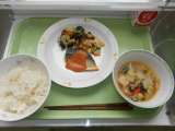 ●本日の献立● 麦ごはん 牛乳 魚のピリ辛ソースかけ 和風サラダ 田舎汁 ●...