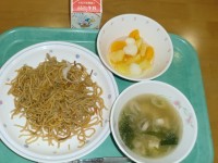 ●本日の献立●塩焼きそば 牛乳 豆腐とえのきだけのスープ フルーツ白玉●主な給食...