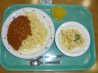 ●本日の献立●スパゲティミートソース 牛乳 ポテト入りフレンチサラダ フルーツゼ...