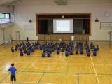 体育館で実施、まずは準備体操から、学年種目や三宿競技などできること進めていまし...