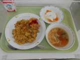 ●本日の献立● カレーピラフ 牛乳 大豆とコーンのフリッター 卵スープ フルー...