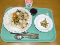 ●本日の献立●里芋ピラフ 牛乳 イタリアンサラダ 野菜のスープ 白ごまプリン●主...