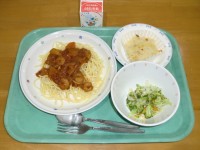 ●本日の献立●セサミビスキュイパン 牛乳 キャベツと鶏肉のカレー煮込み カルボナ...