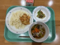 ⚫︎本日の献立⚫︎つけ麺風うどん 牛乳 かきあげ おひたし⚫︎主な給食食材と産地...