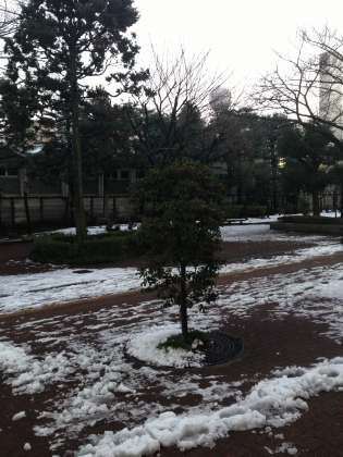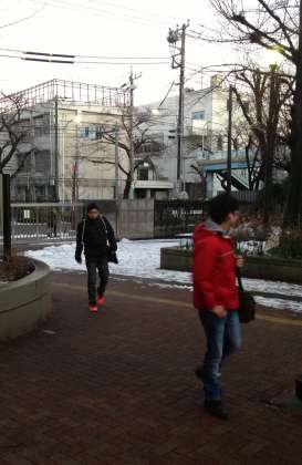 朝まで降った雪が溶けませんでした。寒そうな登校風景です。