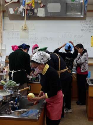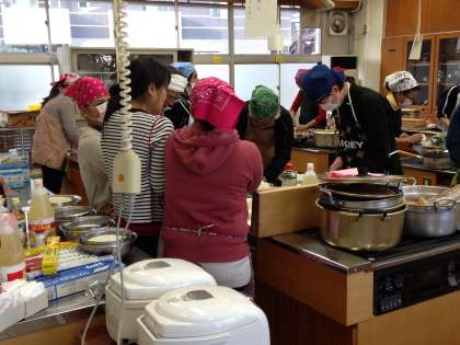 「調理」が始まりました。全員真剣な面持ちで調理中です。