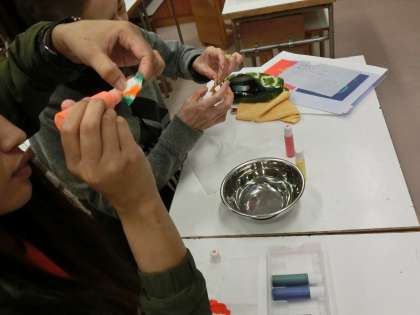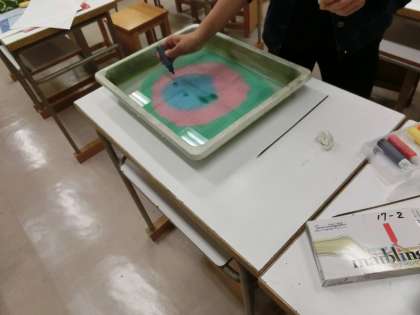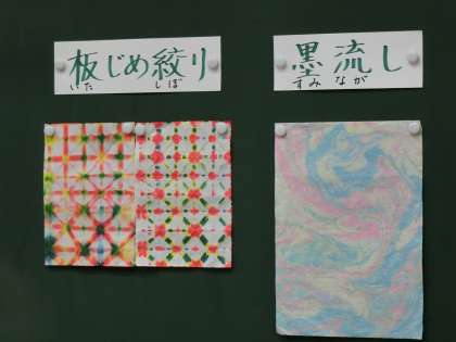 美術の授業では、「板じめ絞り」と「墨流し」を学習しています。