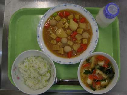 えだまめごまごはん・鶏肉とお芋のうま煮・麦みそ汁 鶏肉・宮崎、こんにゃく・群馬、たまねぎ・北海道、ごぼう・青森、にんじん・千葉、ねぎ・千葉、他。