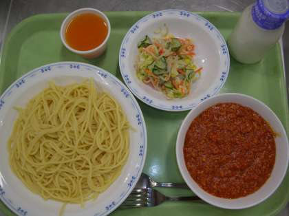 ミートソースパスタ・サラダ・キャロットゼリー