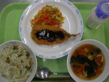 まめごはん・いわしのフライ・鬼キャベツのおかかあえ・すまし汁