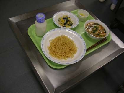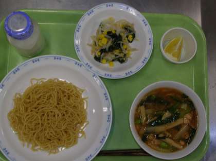 五目やきそば・大根ともやしの塩サラダ・くだもの(みかん・はるか)
