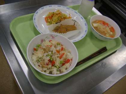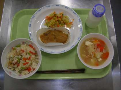 子ぎつねごはん・魚のねぎ味噌焼き・野菜の果汁入りおかか・豆腐とねぎの味噌汁