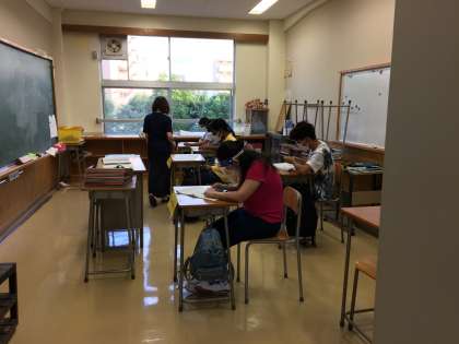 新型コロナウイルス感染予防対策として、授業中でもマスクを着用しています。さらに、発音、発声の機会が多い授業では、フェイスシールドを着用しています。