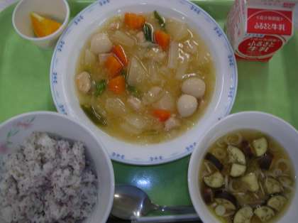 ゆかりごはん・鶏肉と白菜大根のとろみ煮・なすの味噌汁・くだもの