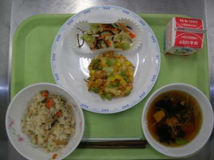 福岡の郷土料理 かしわごはん・かきあげ・キャベツと昆布のあえもの