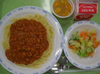 スパゲティミートソース・ポテト入りフレンチサラダ・白桃ゼリー