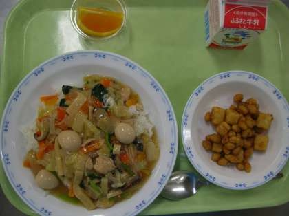 中華丼・大豆と豆腐の甘辛揚げ・くだもの(みかん)