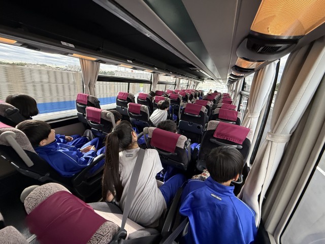 各クラス代表の生徒が運転手さん、ガイドさんに向けて挨拶をしてくれました。今はガイドさんのアナウンスに楽しそうに反応しながらバスに乗っています。