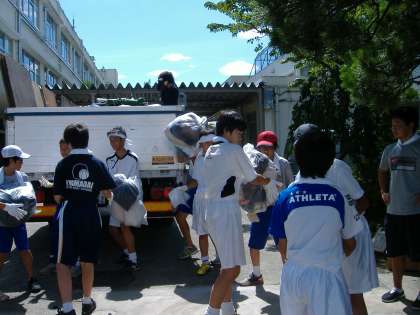 等々力地区町会連合会主催の古着古布回収が、尾山台中学校正門で行われました。地域の方と一緒に、本校ボランティア生徒が、運ばれてきた回収物をトラックに積み込みました。