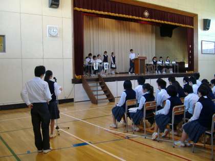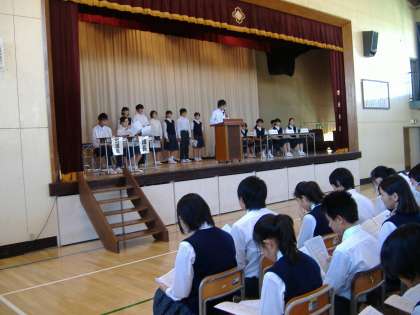 9月27日 後期生徒総会が開かれました。新たに選出された生徒会役員、各委員長から、活動方針が提案され、すべて承認されました。