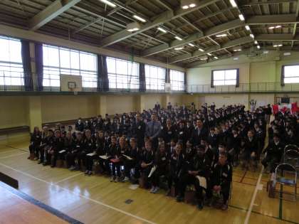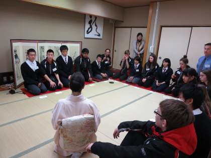 3月12日(水)カナダ、ウイニペグ市中学生訪問団の中学生と先生方が来校しました。全校生徒による歓迎集会、茶道、華道、筝、浴衣の体験をしています。