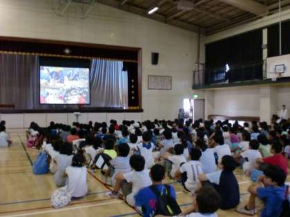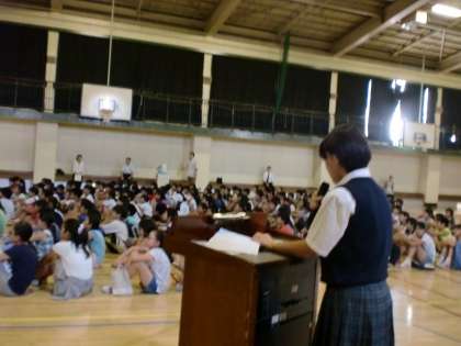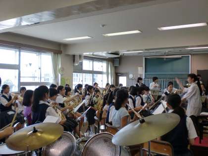 7月11日(金)学び舎の小学生が来校して、見学会と部活動体験が行われました。授業見学後、体育館で生徒会役員のスライドによる中学校生活の説明、部活動体験と続きました。短い時間でしたが、体験後小学生は「楽しかった」と言っていました。写真は小中学生による「カエルの歌」の吹奏楽合奏風景です。