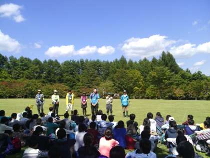 河口湖に着きました。河口湖総合公園で富士山クラブの方から富士山清掃前のお話を聞いています。