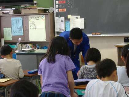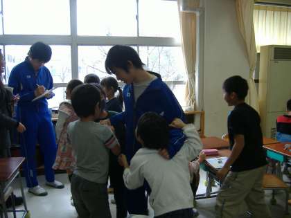 2月24日の「中学生が先生」では、もう1校、尾山台小学校でも交流を行いました。尾山台小学校卒業生の、中学3年生6名は2年生の2学級にお世話になりました。サッカーの技をみせてもらったり、勉強をおしえてもらい、小学生にとって、中学生はあこがれの的になったようでした。