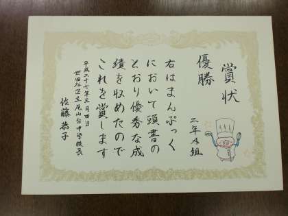 3月18日は今年度最後の朝礼でした。そこで、歯の優良校としての表彰がありました。また、生徒会が初めて取り組んだ「まんぷっく」の表彰もありました。これは、給食を残さず食べようという取組でした。生徒会役員手作りの表彰状が優勝の2年A組、1年C組、準優勝の3年C組に授与されました。