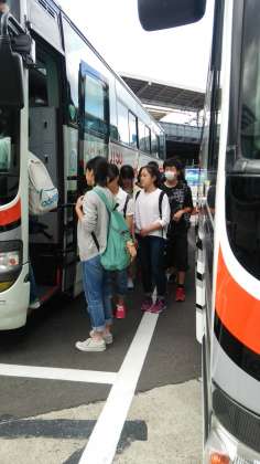 班行動…京都駅続々到着、18班中9班ホテルに戻るべくバス乗車しています。