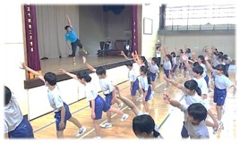 最後は、全校生徒が円になり、ウェーブをしたりジャンプしたり、一体感を感じられる体操になりました。講座の最後に、撮影した「ラベンダー体操の集団演技」をみんなでスクリーンで鑑賞し、達成感を共有することができました。